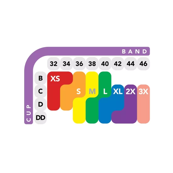 - Sizes: Available in sizes XS-3XL; Sizing Guide S: 34B-36D; M: 36B-38DD; L: 38B-40DD; XL: 40C-42DD; XXL: 42C-44DD; XXXL 46C-DD